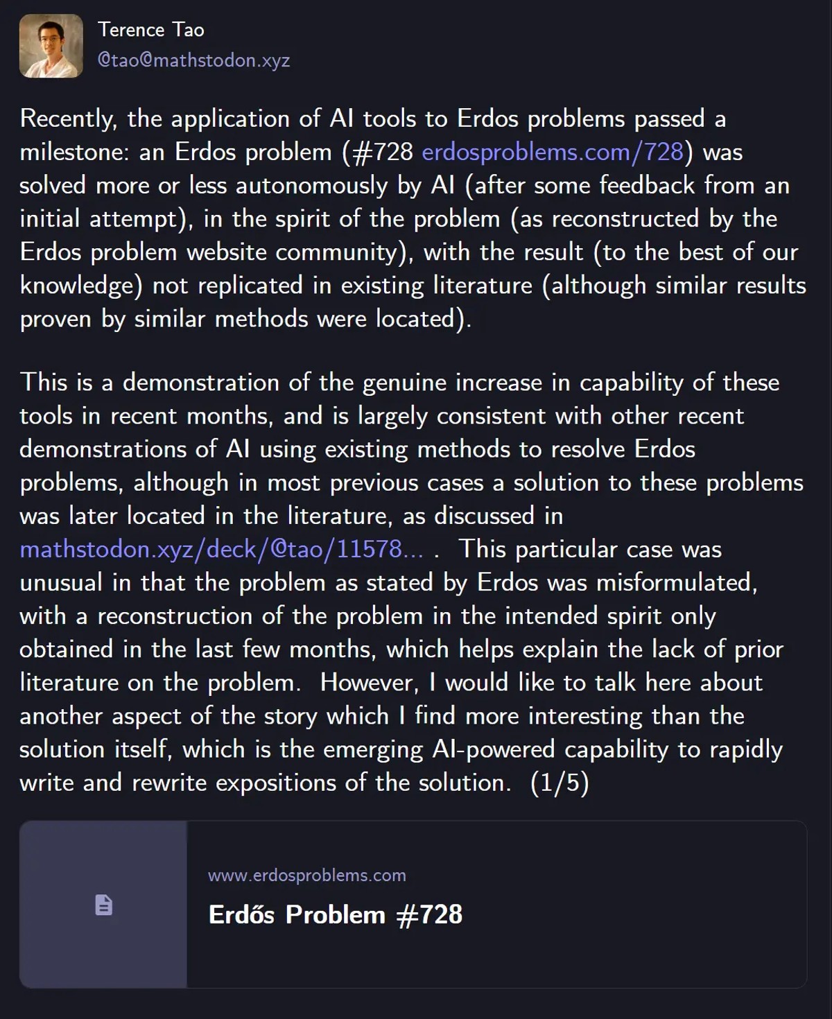 大模型出现后,世界变化太快了,最明显的体感应该就是 AI Coding 对业界的冲击,哪怕是之前说 AI 不能完成有难度代码的高阶程序员们,现在也开始逐渐承认 AI 可以写很多难度很大的代码了。AI 的影响在方方面面,最近陶哲轩的社媒上还介绍了在数学领域的变化:AI 在很大程度上自主地解决了埃尔多什问题,展示了 AI 在数学研究中发现证明和构造解法的能力。
